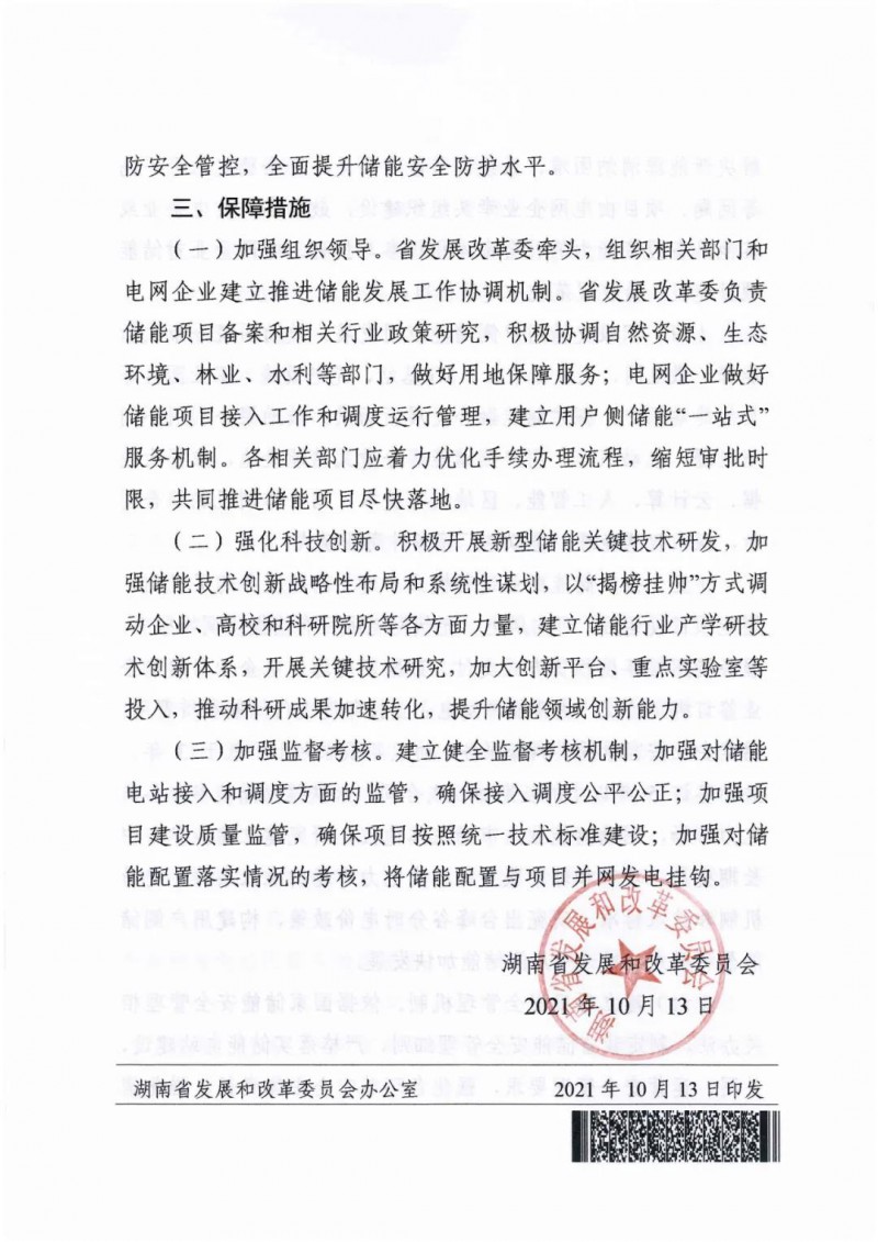 10月13日,湖南省發(fā)改委下發(fā)《關(guān)于加快推動湖南省電化學(xué)儲能發(fā)展的實施意見》,文件明確以發(fā)展電網(wǎng)側(cè)獨立儲能為重點,集中規(guī)劃建設(shè)一批電網(wǎng)側(cè)儲能電站,力爭到2023年建成電化學(xué)儲能電站150萬千瓦/300萬千瓦時以上。