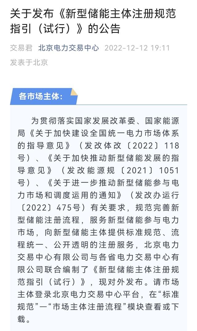 12日晚,北京市電力交易中心發(fā)布《新型儲(chǔ)能主體注冊(cè)規(guī)范指引(試行)》公告(下稱《指引》)。這是交易機(jī)構(gòu)首次從實(shí)施層面統(tǒng)一明確將新型儲(chǔ)能作為獨(dú)立于發(fā)電企業(yè)、售電公司和用戶的注冊(cè)類型,并且規(guī)范了詳細(xì)的注冊(cè)程序與所需信息、資料。