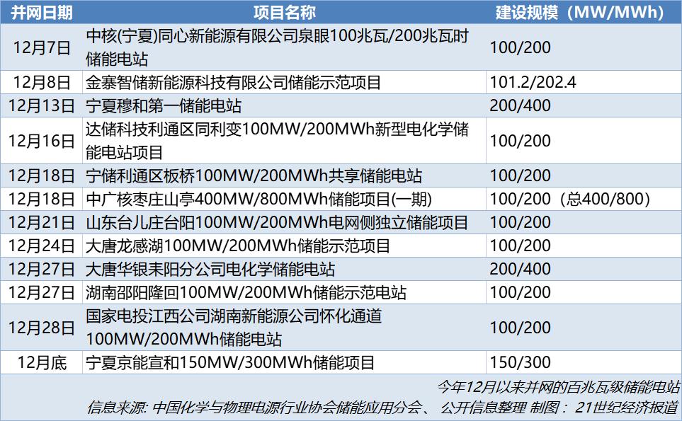 21世紀(jì)經(jīng)濟(jì)報道記者根據(jù)公開信息不完全統(tǒng)計發(fā)現(xiàn),截至12月28日,本月已有28個新型儲能項目完成并網(wǎng)交付。這其中,不乏數(shù)十個百兆瓦級容量的大型地面電站、獨(dú)立共享儲能電站順利并網(wǎng),也誕生了多個地方儲能電站的規(guī)模之最、建設(shè)速度之最。事實上,這也為明年國內(nèi)大型儲能電站的推進(jìn)立下了樂觀的預(yù)期。