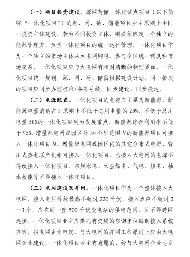 征求意見稿中關(guān)于園區(qū)(居民區(qū))級源網(wǎng)荷儲一體化試點要求中明確:一體化項目的電源配置為不低于總電量20%的新能源,其中不低于總用電量的50%的一體化項目列為重點發(fā)展,新能源綜合利用率不低于95%;儲能配置上要求不低于總裝機容量的15%、時長2小時,并能滿足削減一體化項目 5%高峰用電負荷的要求。