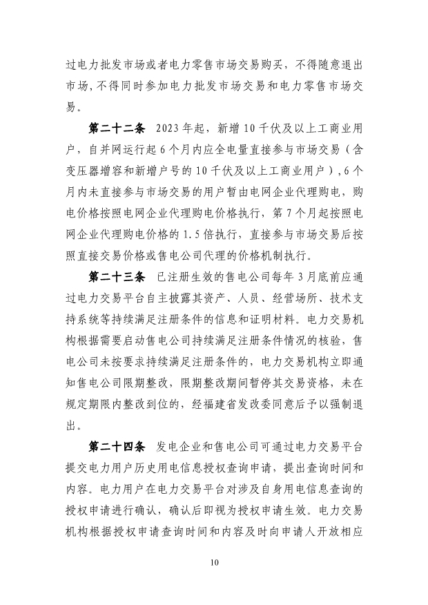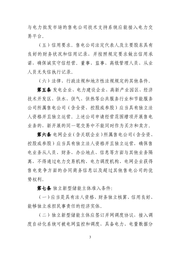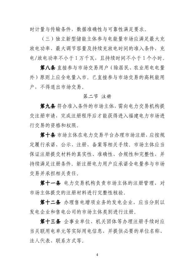 (三)獨(dú)立新型儲(chǔ)能主體參與電能量市場(chǎng)應(yīng)滿足最大充 放電功率、最大調(diào)節(jié)容量及持續(xù)充放電時(shí)間的準(zhǔn)入條件,充 電/放電功率不小于 1 萬千瓦,且持續(xù)時(shí)間不小于 1 個(gè)小時(shí)。 第八條 直接參與市場(chǎng)交易用戶(除居民、農(nóng)業(yè)用電電量 外)原則上應(yīng)全電量入市。已直接參與市場(chǎng)交易的高耗能用 戶,不得退出市場(chǎng)交易。