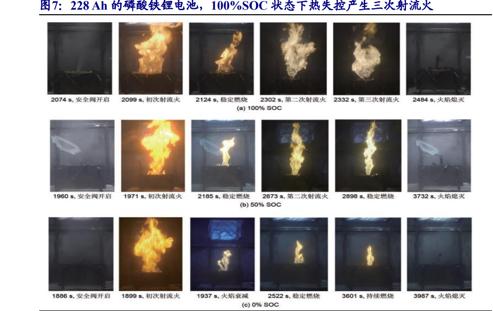 在模擬燃燒實驗中,鋰電池的燃燒過程包括受熱鼓脹、初次射流火、穩(wěn)定燃燒、 多次射流火、火焰熄滅等過程。不同 SOC(電池中剩余的電荷余量,100%為滿電)狀態(tài)下,鋰電池會產生 2-3 次射流火,100%狀態(tài)下熱失控溫度僅為 167℃,而燃燒 峰值溫度將達到 573℃。