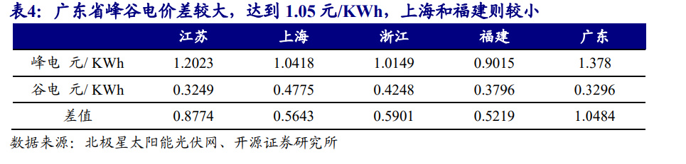 目前儲能站盈利模式的其中一類是采取峰谷電價套利模式,即儲能站在谷時充 電,峰時放電,以此補平電網負荷曲線的同時獲取峰谷電價差值的收益。 參考 2023 年各省電網企業(yè)代理購電價格來看,江蘇、上海、浙江、福建、廣東 等省為代表性較強的省份,選取谷時和高峰時段電價進行比較,上海和福建的峰谷 電價差值較小,僅為 0.56 元、0.52 元/KWh,而廣東則價差較大,達到 1.05 元/KWh。
