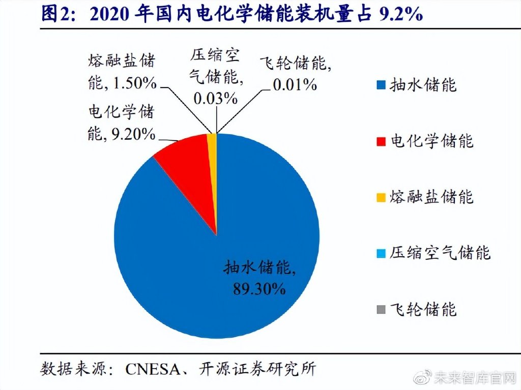 從儲能方式來看,抽水儲能為目前國內累計裝機規(guī)模最大的蓄能方式,占比達 到了 89.3%;其次是電化學儲能,裝機規(guī)模占比為 9.2%。熔融鹽儲熱裝機規(guī)模占比為1.5%;壓縮空氣儲能和飛輪儲能裝機規(guī)模占比都小于 0.1%。電化學儲能中,鋰電池仍 為主導儲能形式,占總量 88.8%,鉛蓄電池為第二大分支,占到 10.2%。