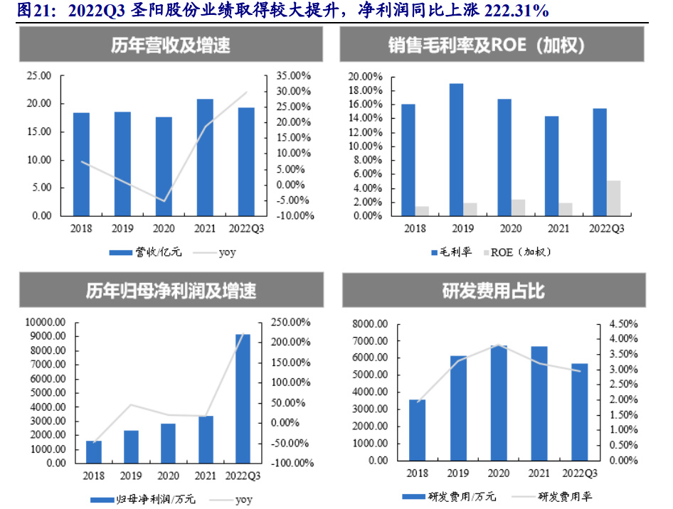 圣陽股份是國內最早自主研發(fā)和生產閥控密封式鉛酸蓄電池的企業(yè)之一,為國 際先進鉛酸蓄電池聯(lián)合會(ALABC)成員、中國電池工業(yè)協(xié)會常務理事單位、中國電 器工業(yè)協(xié)會鉛酸蓄電池分會理事單位、中國照明學會新能源照明專委會會員、中國 電源學會會員等。圣陽股份是山東省第一批高新技術企業(yè),擁有山東省人民政府認 定的企業(yè)技術中心和山東省科技廳認定的高能環(huán)保鉛酸蓄電池工程技術研究中心, 擁有多項核心技術。 財務方面,2022Q3 圣陽股份業(yè)績取得較大提升,營業(yè)收入達到 19.32 億元同比 上漲 29.66%;凈利潤達到 9155.12 萬元同比上漲 222.31%。