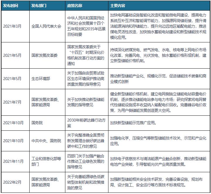 為加快新型儲能示范推廣應(yīng)用,我國發(fā)布了一系列行業(yè)政策,如2022年國家發(fā)展改革委、國家能源局發(fā)布的《關(guān)于加快推動新型儲能發(fā)展的指導意見》提出健全新型儲能價格機制,建立電網(wǎng)側(cè)獨立儲能電站容量電價機制,逐步推動儲能電站參與電力市場;研究探索將電網(wǎng)替代性儲能設(shè)施成本收益納入輸配電價回收。完善峰谷電價政策,為用戶側(cè)儲能發(fā)展創(chuàng)造更大空間。