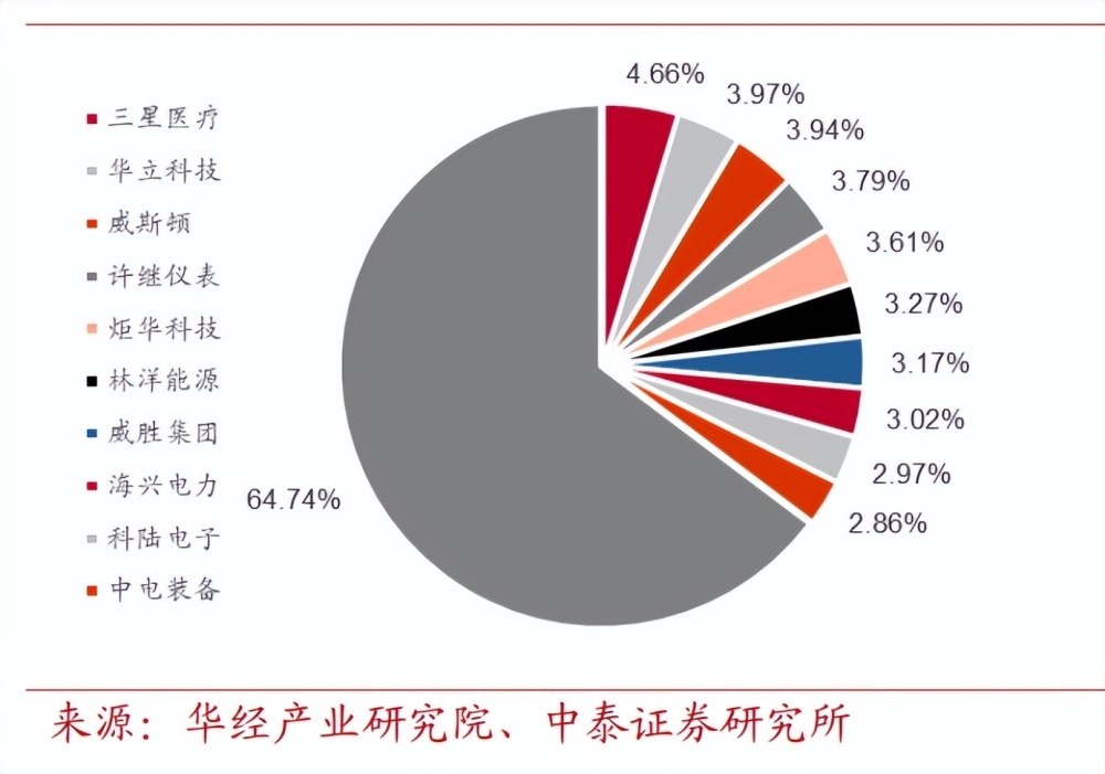 智能電表行業(yè)處于充分競(jìng)爭(zhēng)狀態(tài),市占率穩(wěn)定。參與智能電表及用電信 息集中采集招標(biāo)的企業(yè)數(shù)量較多,國(guó)家電網(wǎng)智能電表及用電信息采集系 統(tǒng)招標(biāo)入圍公司已超過百家,集中度較低,第一梯隊(duì)三星醫(yī)療、東方威 斯頓、許繼電氣、炬華科技市占率維持在 3%-5%左右。長(zhǎng)期來看,市場(chǎng) 訂單分散,我國(guó)智能電表行業(yè)競(jìng)爭(zhēng)格局趨于穩(wěn)定。在 2022 年第一批智 能電表中標(biāo)中,三星醫(yī)療、東方威思頓、科陸電子、許繼、華立科技分 別占比 5.1%、4.8%、4.1%、4.1%、4.1%,其中,科陸電子中標(biāo)份額 較 2021 年有較大提升。