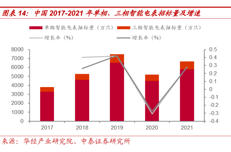 智能電表需求觸底反彈,招標(biāo)量整體保持上升趨勢(shì)。我國(guó)智能電表市場(chǎng) 需求主要來源于國(guó)家電網(wǎng)和南方電網(wǎng),2020 年受疫情影響國(guó)網(wǎng)建設(shè)進(jìn)度 放緩,因此單相、三相智能電表招標(biāo)量同比下降 30.8%、27.5%。隨疫 情好轉(zhuǎn),市場(chǎng)需求恢復(fù),智能電網(wǎng)招標(biāo)量觸底反彈,單相、三相智能電 表招標(biāo)量同比上升 28.3%、27.7%,其中國(guó)家電網(wǎng)招標(biāo)量達(dá) 6674 萬只, 同比增長(zhǎng) 28%,南方電網(wǎng)招額達(dá) 26 億元,同比增長(zhǎng) 49.8%。