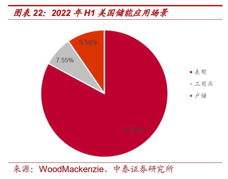 1) 美國(guó):儲(chǔ)能維持高景氣,裝機(jī)量持續(xù)增長(zhǎng)。新型儲(chǔ)能維持高增速,2022 年 H1 裝機(jī)量高企。根據(jù) CNESA 數(shù)據(jù)顯 示,2022H1 美國(guó)儲(chǔ)能新增規(guī)模達(dá) 2.3GW/5.9GWh,同比增長(zhǎng) 188%、 157%。其中表前儲(chǔ)能貢獻(xiàn)了主要裝機(jī)量,2022H1 表前儲(chǔ)能新增裝機(jī) 量達(dá) 1.9GW/5.0GWh,工商業(yè)為 171MW/393MWh,戶儲(chǔ)為 217MW/ 517MWh。美國(guó)儲(chǔ)能產(chǎn)業(yè)機(jī)制成熟,預(yù)計(jì)將保持高景氣,根據(jù) WoodM ackenzie 預(yù)計(jì),美國(guó) 2023-2026 年新增裝機(jī)量分別為 28.4GWh、45. 6GWh、50.7GWh、52.4GWh,預(yù)計(jì) 2022-2026 年新增裝機(jī)量 CAGR 可達(dá) 40.36%。