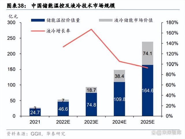 液冷針對(duì)大儲(chǔ)優(yōu)勢(shì)凸顯,未來(lái)市場(chǎng)規(guī)模將快速提升。液冷在技術(shù)上具備優(yōu)勢(shì),當(dāng)前大容量、 高功率儲(chǔ)能系統(tǒng)的快速應(yīng)用,對(duì)于儲(chǔ)能系統(tǒng)散熱效率要求更高。液冷技術(shù)相比于傳統(tǒng)風(fēng)冷 散熱效率更高,同時(shí)噪音更小、能耗更低,具有顯著優(yōu)勢(shì),單位價(jià)值量相比風(fēng)冷也會(huì)有明 顯提升。隨著儲(chǔ)能電站大型化、集約化的不斷發(fā)展,儲(chǔ)能系統(tǒng)大容量、高密度的趨勢(shì)不斷 凸顯,未來(lái)液冷市場(chǎng)規(guī)模預(yù)計(jì)會(huì)快速增長(zhǎng)。根據(jù) GGII,2021 年中國(guó)儲(chǔ)能溫控市場(chǎng)整體規(guī)模 為 24.7 億元,液冷溫控市場(chǎng)規(guī)模 3 億元。GGII 預(yù)計(jì)到 2025 年,中國(guó)儲(chǔ)能溫控市場(chǎng)總規(guī)模 將達(dá)到 164.6 億元,液冷儲(chǔ)能市場(chǎng)價(jià)值將達(dá)到 74.1 億元,占比約 45.1%,年復(fù)合增長(zhǎng)率超 過(guò) 89%。