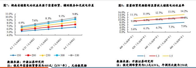 并且在容量租賃獎勵為1.3倍和1.5倍時,其資本金收益率能夠放大至11.1%與13.5%。考慮到當(dāng)前湖南省仍存在較大的電 網(wǎng)側(cè)儲能裝機(jī)缺口,調(diào)峰服務(wù)輔助頻次和價格均有望實現(xiàn)較大的提升,在不考慮容量租賃獎勵的情況下,其資本金收益在年調(diào)用次 數(shù)為330次,調(diào)峰輔助服務(wù)收益為0.4元/kWh的情況下,其資本金收益率能夠達(dá)到9.8%。隨著電力輔助服務(wù)種類增多和電力現(xiàn)貨市場 的開展,其收益方式有望進(jìn)一步增加。同時儲能電站的收益在一定程度上依賴電站運營商自身的運營水平,隨著儲能電站運營商的 經(jīng)驗積累,收益能力有望進(jìn)一步提升。