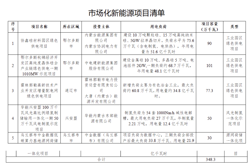 按照《內(nèi)蒙古自治區(qū)工業(yè)園區(qū)綠色供電項目實施細則(2022年版)》《內(nèi)蒙古自治區(qū)風(fēng)光制氫一體化項目實施細則(2022年版)》《內(nèi)蒙古自治區(qū)源網(wǎng)荷儲一體化項目實施細則(2022年版)》要求,我局組織專家對各盟市申報的5個市場化新能源項目方案進行了評估,5個項目均納入市場化新能源項目清單,共配建新能源規(guī)模348.3萬千瓦,其中風(fēng)電259萬千瓦、光伏89.3萬千瓦。經(jīng)報請自治區(qū)人民政府同意,現(xiàn)將市場化新能源項目清單印發(fā)你們,并將有關(guān)要求通知如下。