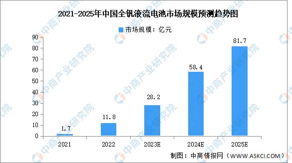 全釩液流電池的市場空間主要來自于儲能需求的增長以及自身滲透率的提升,隨著技術的進步及生產(chǎn)成本的降低,全釩液流電池市場空間將逐步擴大。數(shù)據(jù)顯示,2022年全釩液流電池市場規(guī)模約11.8億元,中商產(chǎn)業(yè)研究院分析師預測,2023年我國全釩液流電池市場規(guī)模將達28.2億元,預計2025年將增至81.7億元,2021-2025年復合年均增長率達163.3%。