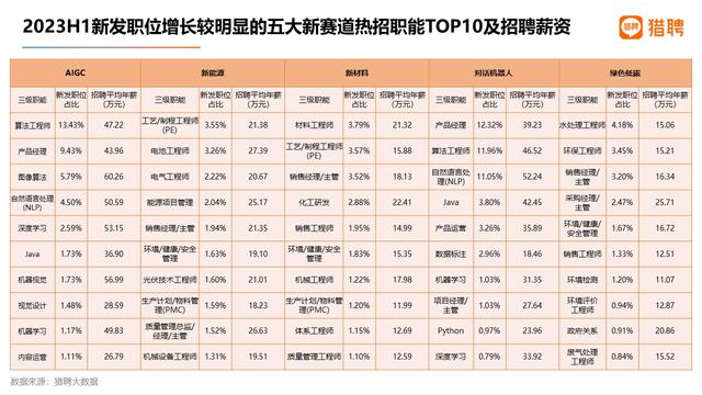 獵聘大數(shù)據(jù)研究院發(fā)布的《2023上半年就業(yè)趨勢(shì)大數(shù)據(jù)洞察》顯示,AIGC(人工智能生成內(nèi)容)、新能源、新材料、對(duì)話機(jī)器人、綠色低碳五個(gè)賽道的新發(fā)職位今年上半年同比增長(zhǎng)相對(duì)明顯,其中新能源位列第二位,數(shù)量同比增長(zhǎng)42.49%。