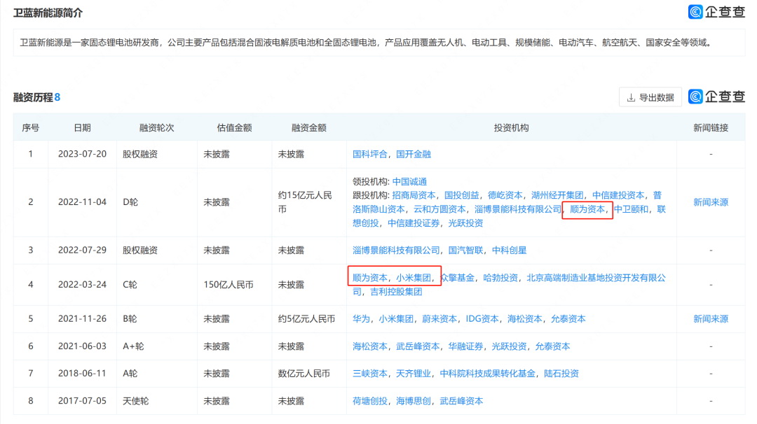 2022年3月,順為資本和小米集團(tuán)將共同投資衛(wèi)藍(lán)新能源,后者為蔚來半固態(tài)電池供應(yīng)商,專注于混合固液電解質(zhì)鋰離子電池和全固態(tài)鋰電池的研發(fā)、生產(chǎn),是中科院物理研究所清潔能源實(shí)驗(yàn)室固態(tài)電池技術(shù)的唯一產(chǎn)業(yè)化平臺(tái)。