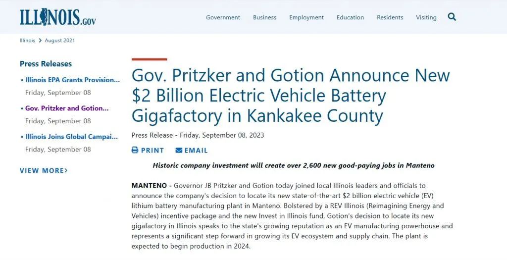 本月初,美國(guó)伊利諾伊州政府官網(wǎng)曾發(fā)布消息,宣布國(guó)軒高科將斥資20億美元(約147億元人民幣)在該州坎卡基縣曼特諾新建電動(dòng)汽車電池超級(jí)工廠。