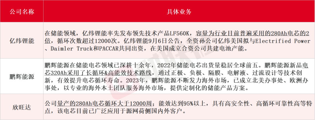 據(jù)財聯(lián)社不完全整理,出口海外的儲能電芯A股上市公司主要為億緯鋰能、鵬輝能源、欣旺達(dá)等,還包括自研電芯配套戶儲終端產(chǎn)品的企業(yè),如比亞迪、派能科技等。而另一邊,儲能電池出海的風(fēng)吹向了大儲,截至目前,已經(jīng)有包括瑞浦蘭鈞、遠(yuǎn)景動力、海辰儲能、億緯鋰能等多家企業(yè)獲海外儲能集成商大單,單筆最大訂單已達(dá)10GWh。A股上市公司具體業(yè)務(wù)如下: