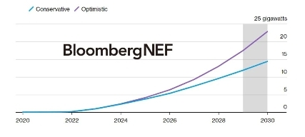 圖:中國液流電池裝機規(guī)模預測(彭博新能源財經(jīng))