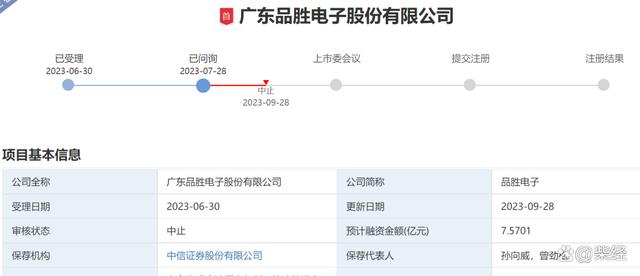 9月28日,深交所官網(wǎng)顯示,廣東品勝電子股份有限公司(以下簡稱“品勝電子”)因更新財務(wù)資料中止IPO。儲能早知道注意到,品勝電子于6月30日獲深交所受理,并首次披露招股書申報稿,于7月28日通過深交所下發(fā)第一次審核問詢函。