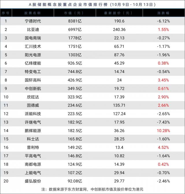 上周(10月9日-10月13日),東方財(cái)富儲(chǔ)能概念板塊微增0.39%,漲勢(shì)已持續(xù)3周。在《華夏時(shí)報(bào)》重點(diǎn)關(guān)注的20家上市儲(chǔ)能企業(yè)中,有9家上漲,11家下跌。鵬輝能源以10.28%的幅度領(lǐng)漲,普利特、國(guó)軒高科、欣旺達(dá)、固德威、比亞迪、南都電源、億緯鋰能和中創(chuàng)新航分別上漲了4.52%、3.45%、2.90%、2.66%、1.55%、0.42%、0.38%和0.61%。