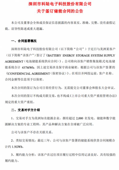 科陸電子10月17日公告,公司于近日與美洲某客戶簽訂了《電池儲(chǔ)能系統(tǒng)供應(yīng)合同》,公司將向該客戶銷售集裝箱式電池儲(chǔ)能系統(tǒng)合計(jì)437MWh。