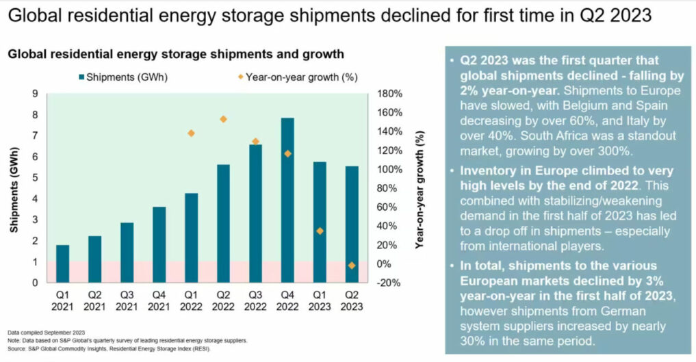 標(biāo)準(zhǔn)普爾全球(S&P Global)公司在日前發(fā)布的一份研究報(bào)告指出,在能源價(jià)格波動(dòng)較小、庫(kù)存高企以及成本上升的背景下,全球戶用儲(chǔ)能系統(tǒng)出貨量在2023年第二季度首次同比下降。