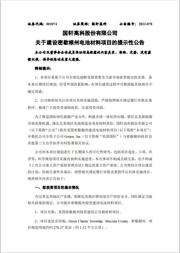 從最新公告的情況來看,國軒高科赴美投建材料工廠事項已經(jīng)靴子落地,而工廠選址與投資額與此前消息基本相符。