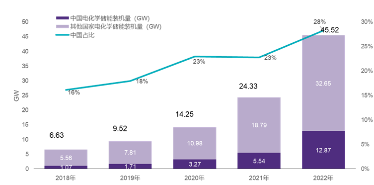 電化學儲能市場近年來裝機規(guī)模顯著提高。從全球范圍來看,2018年的裝機量是6.63GW,而到了2022年,這個數(shù)字已經(jīng)大幅增長到45.52GW。其中,中國市場的占比也有顯著提升,從2018年的16%增長到2022年的28%。