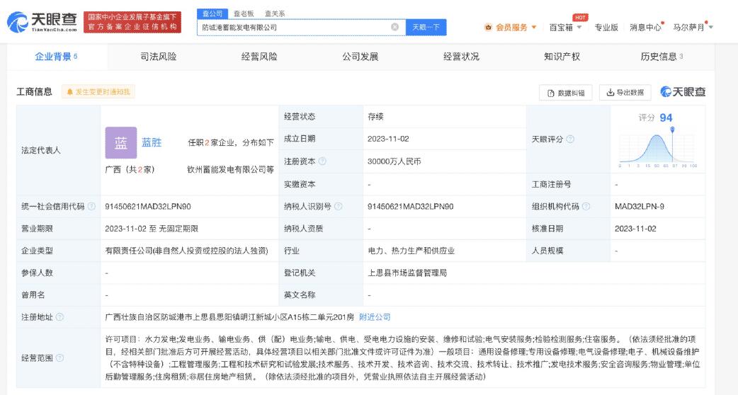 南方財經11月7日電,天眼查App顯示,近日,防城港蓄能發(fā)電有限公司成立,法定代表人為藍勝,注冊資本3億人民幣,經營范圍含水力發(fā)電、電氣安裝服務、通用設備修理、電氣設備修理、工程管理服務、發(fā)電技術服務、單位后勤管理服務、非居住房地產租賃等。股東信息顯示,該公司由南網儲能全資持股。