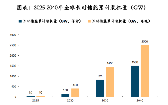 由中國(guó)能源研究會(huì)發(fā)布的《構(gòu)建新型電力系統(tǒng)路徑研究》報(bào)告顯示,2020—2030年,新能源在國(guó)家能源結(jié)構(gòu)中的占比將逐步提高,預(yù)計(jì)風(fēng)光發(fā)電占比將從2020年的9.3%提高到2030年的22.5%。根據(jù)麥肯錫數(shù)據(jù),長(zhǎng)時(shí)儲(chǔ)能于2025年起開(kāi)始大規(guī)模增長(zhǎng)。2030年起全球可再生能源滲透率將升至約60%—70%,長(zhǎng)時(shí)儲(chǔ)能累計(jì)裝機(jī)量將達(dá)到150-400GW(對(duì)應(yīng)儲(chǔ)能容量5-10TWh),累計(jì)投資規(guī)模將達(dá)到2000億-5000億美元。到2040年,長(zhǎng)時(shí)儲(chǔ)能累計(jì)裝機(jī)量將加速達(dá)到1.5-2.5TW(對(duì)應(yīng)儲(chǔ)能容量85-140TWh),是目前全球儲(chǔ)能系統(tǒng)裝機(jī)量的8-15倍,累計(jì)投資額將達(dá)到1.5萬(wàn)億-3萬(wàn)億美元。