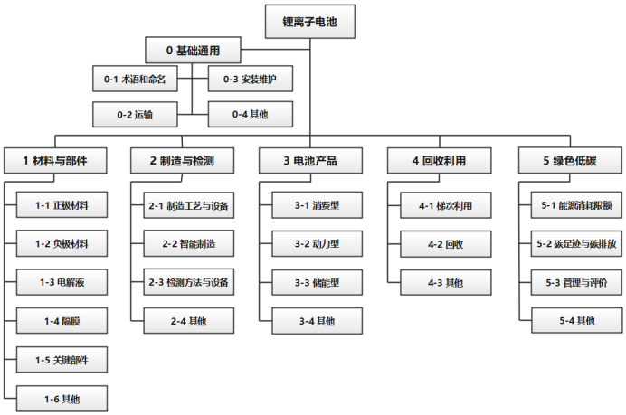 鋰離子電池綜合標(biāo)準(zhǔn)化技術(shù)體系主要包括基礎(chǔ)通用、材料與部件、制造與檢測(cè)、電池產(chǎn)品、回收利用、綠色低碳6大類、25個(gè)小類(見圖2)。