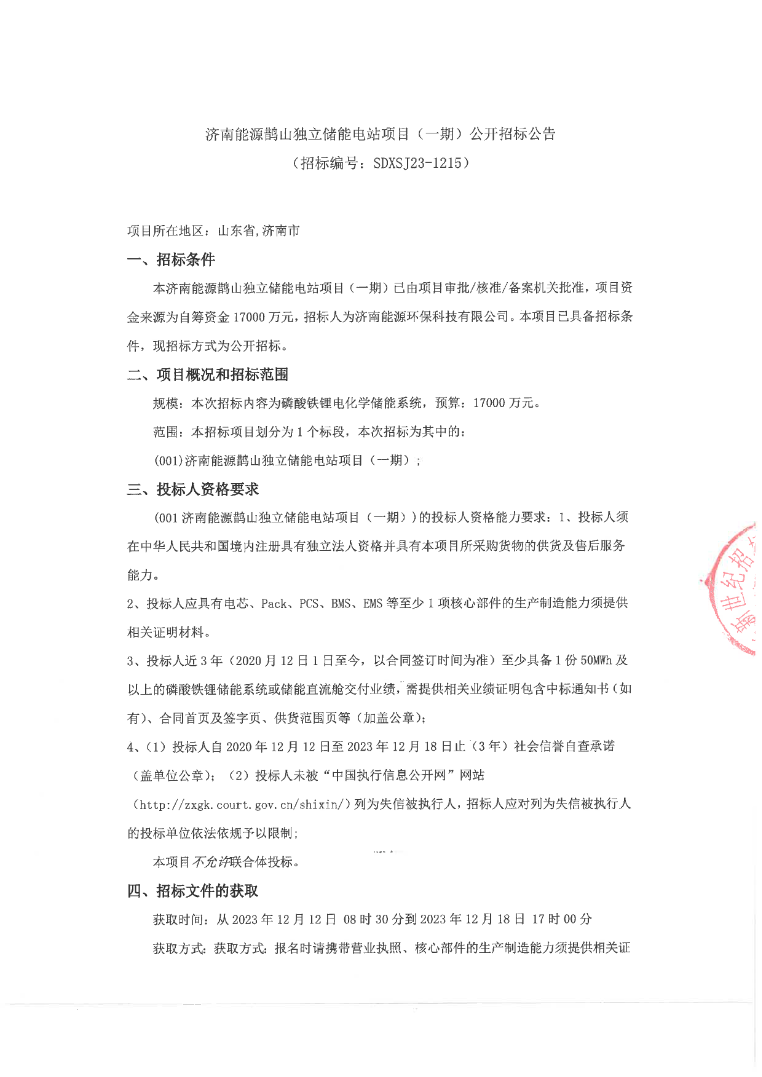 12月11日,濟(jì)南能源鵲山獨(dú)立儲(chǔ)能電站項(xiàng)目(一期)公開招標(biāo)。項(xiàng)目預(yù)算為1.7億元,招標(biāo)內(nèi)容為磷酸鐵鋰電化學(xué)儲(chǔ)能系統(tǒng)。