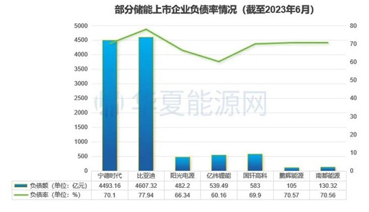 華夏能源網(wǎng)注意到,在不切實(shí)際的瘋狂擴(kuò)充下,高負(fù)債已成儲(chǔ)能行業(yè)常態(tài),行業(yè)龍頭也不例外。數(shù)據(jù)顯示,截至今年6月底,比亞迪(SZ:002594)、鵬輝能源、南都電源(SZ:300068)、寧德時(shí)代(SZ:300750)的負(fù)債率均超過(guò)了70%;國(guó)軒高科(SZ:002074)、陽(yáng)光電源(SZ:300274)也超過(guò)60%。