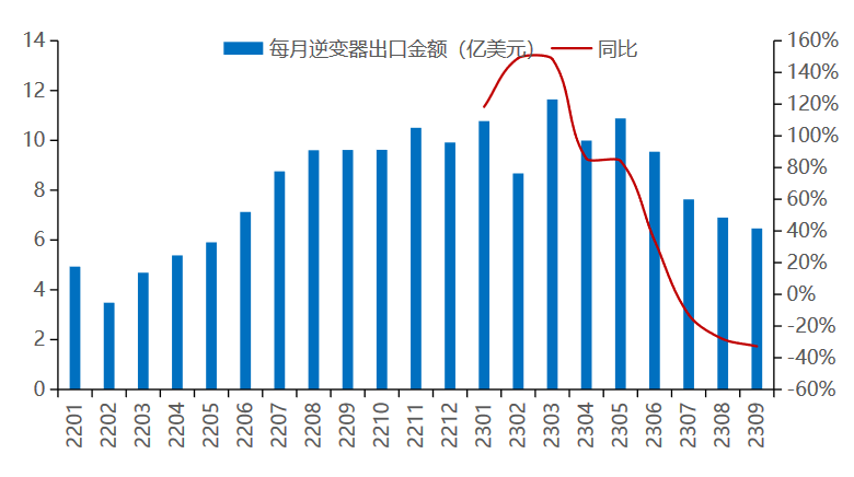 2023年9月國(guó)內(nèi)出口光儲(chǔ)逆變器金額6.5億美元,同比-33%,環(huán)比-6%;