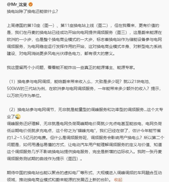 近日,智車派注意到,蔚來(lái)副總裁沈斐在微博發(fā)文稱,在丹麥的換電站已經(jīng)成功開始向電網(wǎng)提供調(diào)頻服務(wù),這是蔚來(lái)能源在歐洲的一小步,也是整個(gè)換電商業(yè)模式的一大步,標(biāo)志著換電站作為儲(chǔ)能設(shè)備參與電網(wǎng)調(diào)頻服務(wù)。沈斐表示,期待中國(guó)的換電站也能以聚合的虛擬電廠等形式,大規(guī)模進(jìn)入調(diào)峰調(diào)頻的車網(wǎng)融合互動(dòng)領(lǐng)域。