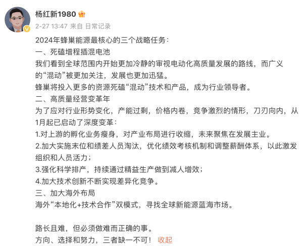 在這條微博中,楊紅新指出了2024年蜂巢能源最核心的三個(gè)戰(zhàn)略任務(wù),除了上述“高質(zhì)量經(jīng)營(yíng)變革”的任務(wù),還包括死磕增程插混電池、加大海外布局兩項(xiàng)。