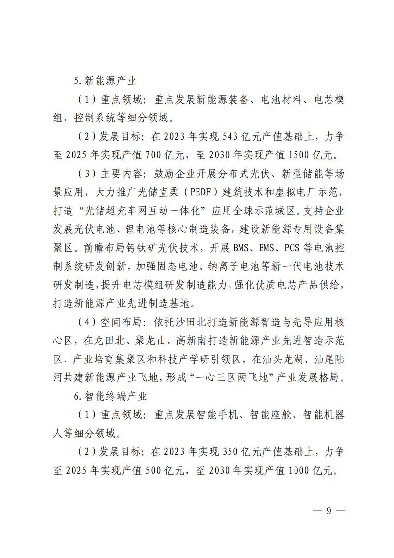 3月14日,坪山區(qū)人民政府發(fā)布關(guān)于打造具備國際競爭力的產(chǎn)業(yè)集群和培育具有發(fā)展?jié)摿Φ漠a(chǎn)業(yè)集群的意見,文件指出,在2023年實現(xiàn)543億元產(chǎn)值基礎(chǔ)上,力爭至2025年實現(xiàn)產(chǎn)值700億元,至2030年實現(xiàn)產(chǎn)值1500億元。主要內(nèi)容涉及鼓勵企業(yè)開展分布式光伏、新型儲能等場景應(yīng)用,大力推廣光儲直柔(PEDF)建筑技術(shù)和虛擬電廠示范,打造“光儲超充車網(wǎng)互動一體化”應(yīng)用全球示范城區(qū)。支持企業(yè)發(fā)展光伏電池、鋰電池等核心制造裝備,建設(shè)新能源專用設(shè)備集聚區(qū)。前瞻布局鈣鈦礦光伏技術(shù),開展BMS、EMS、PCS等電池控制系統(tǒng)研發(fā)創(chuàng)新,加強(qiáng)固態(tài)電池、鈉離子電池等新一代電池技術(shù)研發(fā)制造,提升電芯模組研發(fā)制造能力,強(qiáng)化優(yōu)質(zhì)電芯產(chǎn)品供給,打造新能源產(chǎn)業(yè)先進(jìn)制造基地。