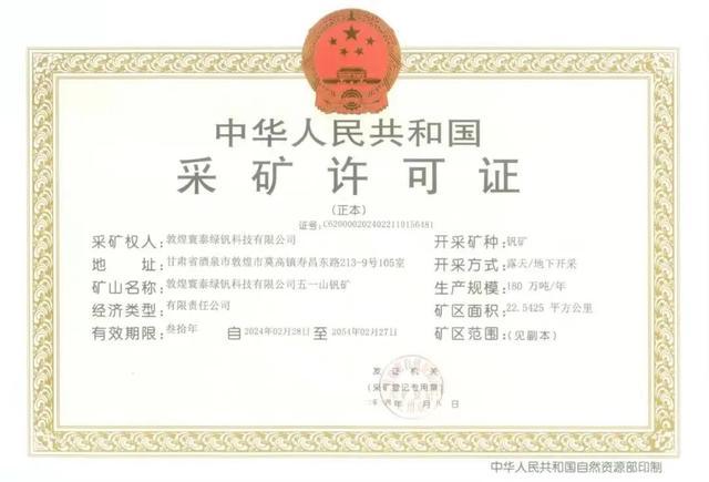 此次獲得開(kāi)采權(quán)的礦山名稱(chēng)為敦煌寰泰綠釩科技有限公司五一山釩礦,有效期限三十年,開(kāi)采礦種為釩礦,礦床規(guī)模為中型,開(kāi)采規(guī)模為180萬(wàn)噸/年,礦區(qū)面積為22.5425平方公里。