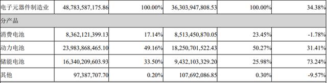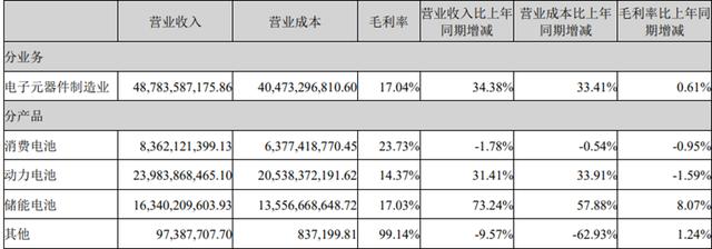 由于多數(shù)訂單為長期合同,儲(chǔ)能電池業(yè)務(wù)受價(jià)格戰(zhàn)影響較小,營業(yè)收入達(dá)到163.4億元,同比增長73.24%,占總營收的33.5%,毛利率也提升了8.07個(gè)百分點(diǎn)至17.03%。