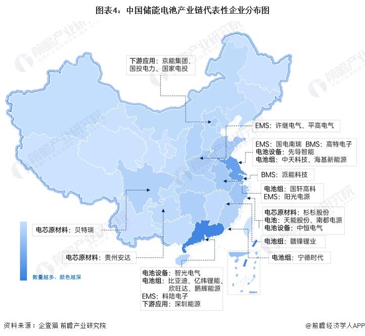 從代表性企業(yè)分布情況來看,廣東、江蘇代表性企業(yè)較多,企業(yè)競爭力強,覆蓋儲能電池全產(chǎn)業(yè)鏈。同時部分區(qū)域在儲能電池產(chǎn)業(yè)鏈中有代表性企業(yè),如廣東比亞迪、億緯鋰能、欣旺達等 ; 福建寧德時代 ; 上海派能科技; 江蘇國電南瑞; 安徽國軒高科 ; 浙江天能股份等。