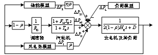 隨著風電滲透率的提升,系統(tǒng)頻率響應能力逐漸降低,所以系統(tǒng)頻率響應模型中需引入表征風電滲透率的變量。風電滲透率為ρ時,系統(tǒng)頻率響應模型如圖1所示。