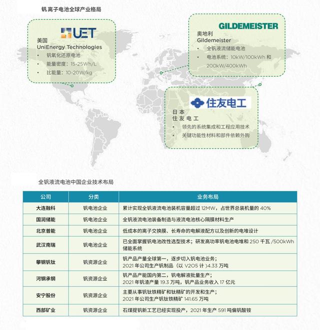 2022 年全釩液流電池整個(gè)行業(yè)還處于商業(yè)化進(jìn)程緩慢階段,全球范圍內(nèi)只有日本住友電工、美國(guó) UniEnergyTechnologies、奧地利 Gildemeister 和中國(guó)大連融科能提供成熟的商業(yè)化產(chǎn)品。2023年,隨著我國(guó)在長(zhǎng)時(shí)儲(chǔ)能、價(jià)格補(bǔ)償、鼓勵(lì)釩資源開發(fā)等支持政策的落地生效以及資本市場(chǎng)的追捧,全釩液流電池賽道創(chuàng)新企業(yè)涌現(xiàn),推動(dòng)我國(guó)全釩液流儲(chǔ)能技術(shù)和產(chǎn)業(yè)發(fā)展向世界領(lǐng)先水平邁進(jìn)。