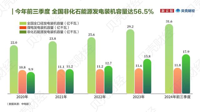 中國電力企業(yè)聯(lián)合會統(tǒng)計數(shù)據(jù)顯示,截至2024年9月底,全國全口徑發(fā)電裝機容量31.6億千瓦,煤電占總發(fā)電裝機容量的比重為37.3%,同比降低4.4個百分點;非化石能源發(fā)電裝機容量17.9億千瓦,同比增長24.0%,占總裝機容量比重為56.5%,比上年同期提高4.5個百分點。這表明中國能源結(jié)構(gòu)持續(xù)優(yōu)化,清潔能源在總裝機中的重力提升,為實現(xiàn)“雙碳”目標奠定了基礎(chǔ)。