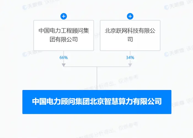 股權(quán)穿透顯示,該公司由中國能建旗下中國電力工程顧問集團有限公司和北京躍網(wǎng)科技有限公司共同持股。