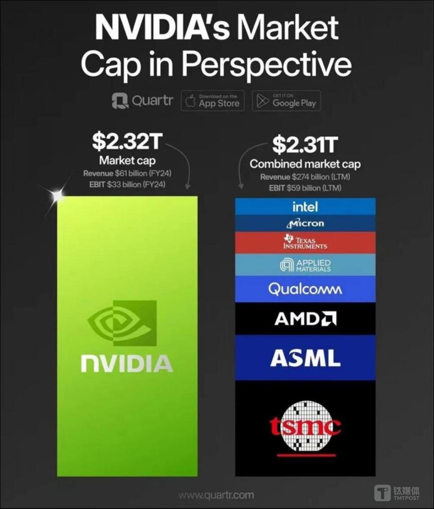 鈦媒體App 5月24日消息,截至今早美股收盤,“AI之王”英偉達(dá)(NASDAQ:NVDA)市值一天內(nèi)暴漲2180億美元(約合人民幣1.56萬(wàn)億元),達(dá)到2.56萬(wàn)億美元市值——超過(guò)臺(tái)積電、阿斯麥、AMD、高通、應(yīng)用材料、德州儀器、美光科技、英特爾等半導(dǎo)體巨頭的市值總和。同時(shí),股價(jià)也首次沖破1000美元/股,創(chuàng)下歷史新高。