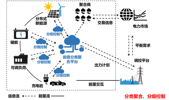 (十五)推動源網(wǎng)荷儲電力資源分類分級聚合。基于統(tǒng)一的數(shù)字底座、物聯(lián)采集與實時量測中心等技術(shù)架構(gòu),建立和完善省級源網(wǎng)荷儲分類聚合平臺,通過統(tǒng)一平臺對源網(wǎng)荷儲四側(cè)資源分散聚合控制,實現(xiàn)電力系統(tǒng)分層分級的綜合動態(tài)平衡。開展源網(wǎng)荷儲分類分級聚合頂層設(shè)計,研究制定分類分級聚合的技術(shù)路徑和實施方案。推動分布式光伏運營監(jiān)測平臺、配電監(jiān)控系統(tǒng)的升級改造和分級應(yīng)用,實現(xiàn)對分布式光伏的“剛性控”“柔性控”“群調(diào)群控”等多場景靈活控制。完善常規(guī)中小電源聚合平臺,調(diào)動中小電源深度聚合的積極性,提升中小電源統(tǒng)一調(diào)度能力,實現(xiàn)廣域協(xié)同、靈活互動。深化建設(shè)新型負荷管理平臺,提升新型負荷管理系統(tǒng)智能化、實用化水平,對負荷資源分層分類統(tǒng)一管理、統(tǒng)一調(diào)控、統(tǒng)一服務(wù)。建設(shè)用戶側(cè)儲能監(jiān)控平臺,分級分類接入用戶側(cè)儲能電站數(shù)據(jù),實現(xiàn)海量用戶側(cè)儲能資源更大范圍的共享互濟和優(yōu)化配置。建立適應(yīng)源網(wǎng)荷儲分類分級聚合的調(diào)度模式和交易機制,貫穿省、市、縣三級調(diào)度系統(tǒng),制定并網(wǎng)管理、運行控制相關(guān)標(biāo)準(zhǔn)規(guī)范,完善清潔能源、需求側(cè)資源和儲能參與電力市場的機制,依托統(tǒng)一的信息共享和技術(shù)支持平臺,培育多類型聚合商參與分層分級聚合調(diào)度。構(gòu)建基于電網(wǎng)一張圖的新型電力系統(tǒng)全要素數(shù)字底座,開展新型電力系統(tǒng)各要素承載力的可視化推演計算,實現(xiàn)配網(wǎng)各環(huán)節(jié)、各業(yè)務(wù)以及新要素的全面圖上管控,提升分布式資源消納能力。