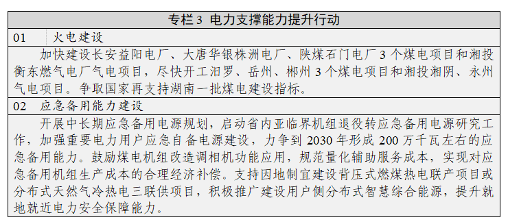 (八)提升電力應(yīng)急備用能力。加強極端形勢下電力風(fēng)險管控,做好應(yīng)對自然災(zāi)害、尖峰負荷、大面積停電、電網(wǎng)攻擊等情況的保供預(yù)案,提高應(yīng)急處置和抗災(zāi)能力。開展中長期應(yīng)急備用電源規(guī)劃,按照最大負荷3%—4%疊加新能源裝機容量1%—3%標(biāo)準(zhǔn)配置應(yīng)急備用電源規(guī)模。落實國家應(yīng)急備用電源管理要求,科學(xué)認定和退出應(yīng)急備用機組,對符合能效、環(huán)保、安全等政策和標(biāo)準(zhǔn)要求的退役火電機組,按照“關(guān)而不拆”原則轉(zhuǎn)為應(yīng)急備用電源,做好設(shè)備維護和燃料供應(yīng)保障。支持分布式天然氣發(fā)電項目建設(shè),在有規(guī)模熱(冷)負荷的工業(yè)園區(qū)、經(jīng)濟開發(fā)區(qū)、空港新區(qū)等區(qū)域,因地制宜建設(shè)背壓式燃煤熱電聯(lián)產(chǎn)項目或分布式天然氣冷熱電三聯(lián)供項目,積極推廣建設(shè)用戶側(cè)分布式智慧綜合能源,提升就地就近電力安全保障能力。加強政府、醫(yī)院、鐵路、民航等重要電力用戶應(yīng)急自備電源建設(shè),力爭實現(xiàn)應(yīng)配盡配全面覆蓋,電源容量應(yīng)滿足全部保安負荷需求。加強抽水蓄能電站應(yīng)急備用能力建設(shè),推動抽水蓄能電站具備黑啟動功能。做好一次能源監(jiān)測預(yù)警和供應(yīng)協(xié)調(diào),提升電源發(fā)電能力,利用負荷和電源的時空互補特性,有效提高湖南與其他區(qū)域間電力互補互濟、調(diào)劑余缺能力。