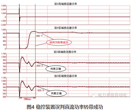 直流故障前后總損失的功率是穩(wěn)控系統(tǒng)執(zhí)行控制策略的重要依據(jù)。直流故障暫態(tài)過程復(fù)雜,若由穩(wěn)控裝置計(jì)算事故前功率與事故后的穩(wěn)態(tài)功率差,事故前后的時(shí)間窗口Δt難以確定。實(shí)踐表明:Δt過短(最初設(shè)計(jì)為30ms),可能會(huì)誤判健全換流器的轉(zhuǎn)帶;而延長Δt,即便是增加至300ms,在某些運(yùn)行工況下,仍然會(huì)出現(xiàn)誤判為轉(zhuǎn)帶失敗(如圖3)或誤判為轉(zhuǎn)帶成功(如圖4)的情況。經(jīng)過大量實(shí)驗(yàn)數(shù)據(jù)分析,若要確保在所有故障工況下裝置均不會(huì)誤判,則Δt至少需延長至500ms以上,無法滿足電網(wǎng)的穩(wěn)定控制需求。