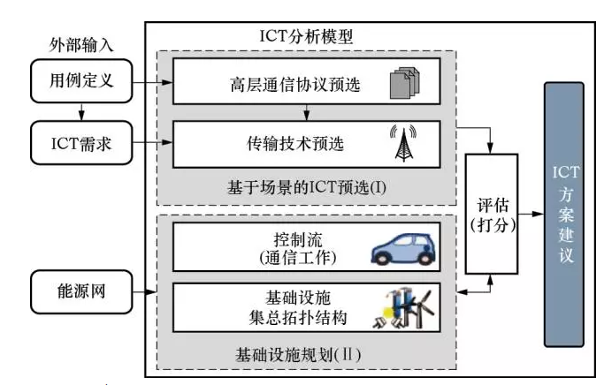 對ICT的研究是個(gè)較為前沿的課題。文獻(xiàn)[10]提出了一種應(yīng)用于智能配電網(wǎng)規(guī)劃的ICT模型,如圖3所示。此模型主要分為兩部分:基于場景的預(yù)選和基礎(chǔ)設(shè)施規(guī)劃。首先,不考慮網(wǎng)絡(luò)和基礎(chǔ)設(shè)施的具體情況進(jìn)行預(yù)選,生成ICT技術(shù)方案通用集合和高層協(xié)議;其次,針對具體的能源網(wǎng)進(jìn)行基礎(chǔ)設(shè)施規(guī)劃,確定若干ICT技術(shù)方案;這兩部分均依賴于由規(guī)劃人員提供的外部數(shù)據(jù),例如所定義的用例和對ICT的各種需求。最后,對兩部分的輸出進(jìn)行成本效益分析,針對給定的外部數(shù)據(jù)確定合適的ICT技術(shù)方案。正如文獻(xiàn)[10]所指出的,對ICT進(jìn)行合理規(guī)劃可以避免使用擴(kuò)建電網(wǎng)的傳統(tǒng)手段,延緩電網(wǎng)的一次投資。