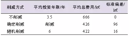 由于規(guī)劃周期較長,考慮了未來峰荷發(fā)展和DG接入容量的變電站規(guī)劃面臨很大的不確定性和投資風(fēng)險(xiǎn),所以必須進(jìn)行風(fēng)險(xiǎn)評估。文獻(xiàn)[7]在相同功率約束條件下,對投資變電站和削減配電側(cè)DG發(fā)電出力兩種技術(shù)方案進(jìn)行了比較,給出了優(yōu)化的折中方法。該文獻(xiàn)以30MW變電站接入不同光伏容量(0、1、9.5MW)的情形為例,對各種削減模式下延緩?fù)顿Y的效果進(jìn)行了比較,結(jié)果如表2所示,與不削減DG容量相比,采用確定(定時(shí))削減方式,投資年限可延緩3.4年,投資費(fèi)用可減少9.6萬歐元;采用隨機(jī)削減方式,投資年限則可延緩2.5年、投資費(fèi)用可減少1.6萬歐元。因?yàn)閷?shí)際參數(shù)的隨機(jī)特性會影響計(jì)算結(jié)果,所以真正的延緩?fù)顿Y效果主要取決于預(yù)測模型的精度。